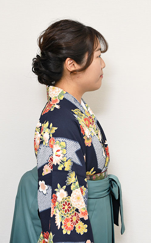 慶應義塾大学のR.Mさんの袴着こなし&ヘアスタイルスナップ・アップ・青紺系・小振袖